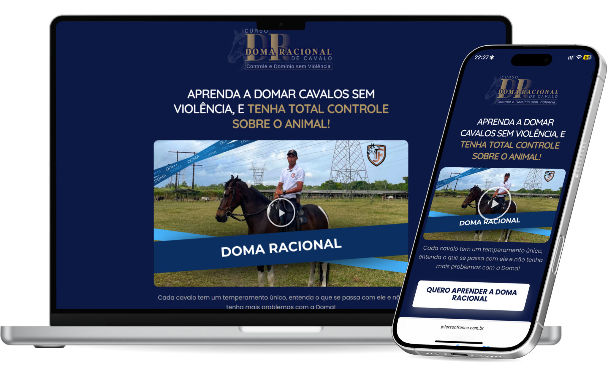curso sobre doma racional de cavalos, com foco em conversão e experiência mobile. Design responsivo, estrutura otimizada e vídeo de apresentação integrado.