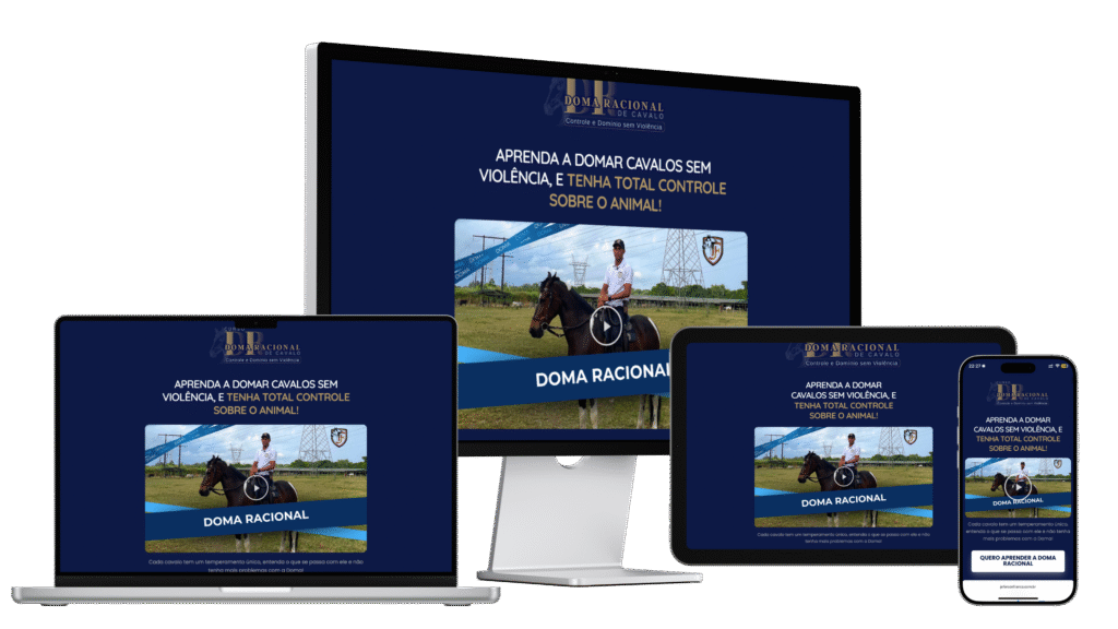 curso sobre doma racional de cavalos, com foco em conversão e experiência mobile. Design responsivo, estrutura otimizada e vídeo de apresentação integrado.